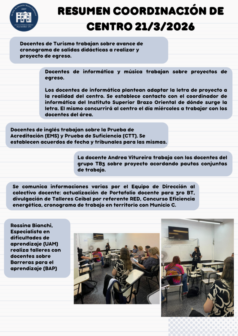 Resumen coordinación de centro 21/03 Publicación de la entrada:24 de marzo de 2026 También podría gustarte Calendario de exámenes cursos terciarios 3 de febrero de 2025 Nuevo correo electrónico institucional 5 de mayo de 2023 EXAMENES EMP-EMT SETIEMBRE 6 de septiembre de 2023